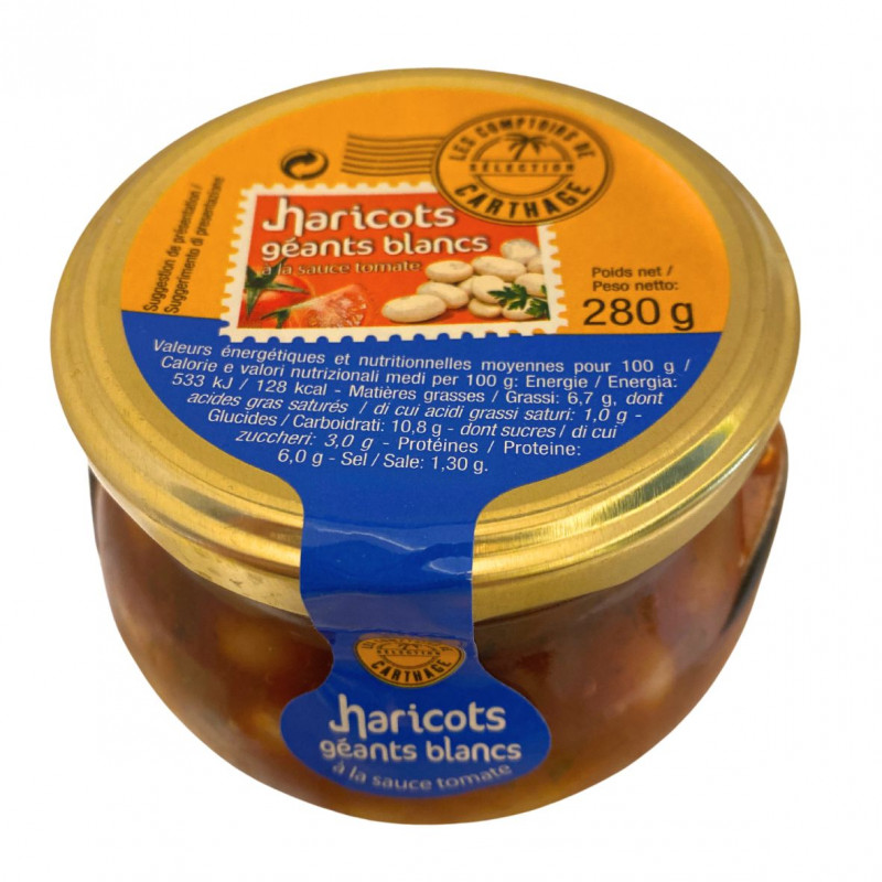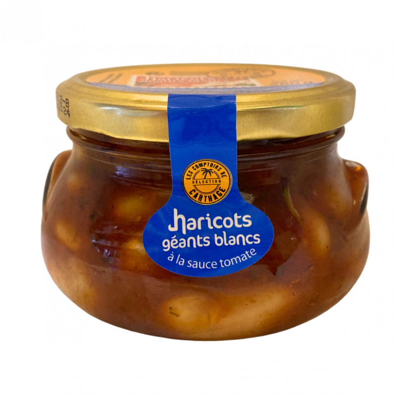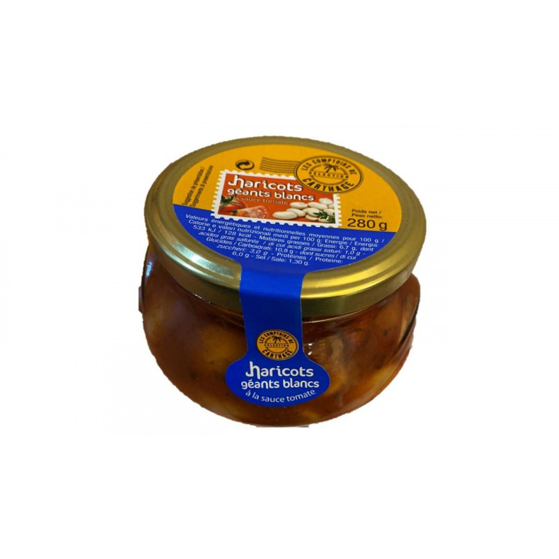 Haricots cuisinés à la sauce tomate. La cuisson douce et maîtrisée conserve toutes les qualités nutritionnelles de ces haricots géants. Tendres et savoureux vous pouvez les consommer chauds ou froids comme plat avec du pain ou en accompagnement de viandes ou poissons.