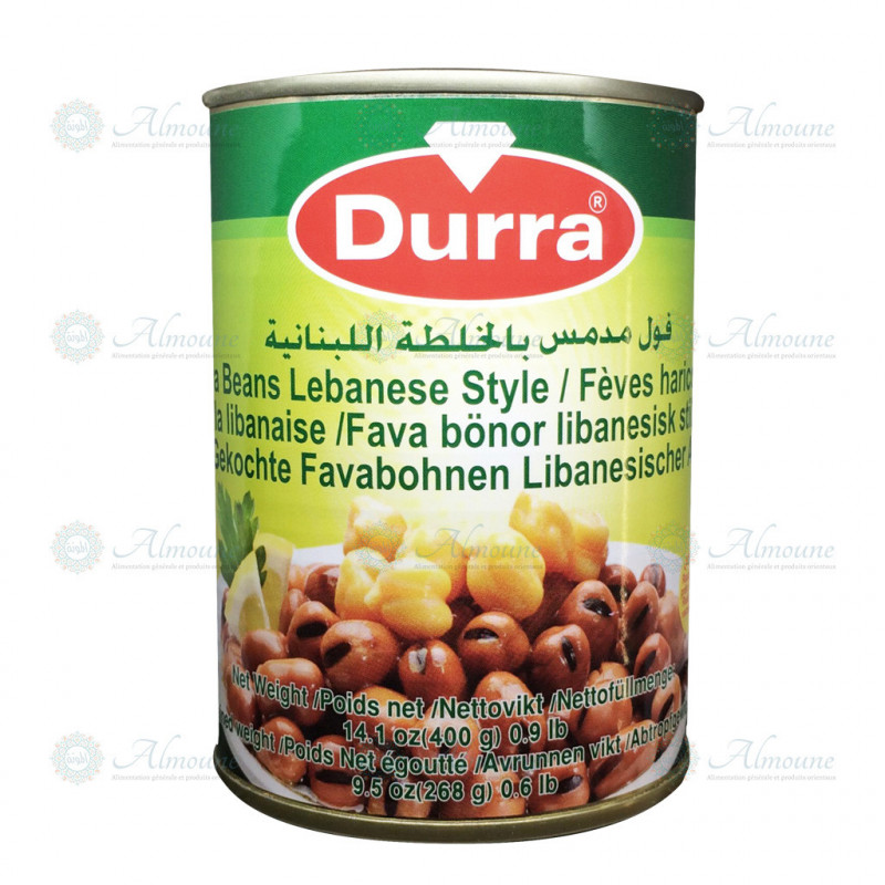 Cette boîte de foul est une recette libanaise qui contient des fèves, des pois chiches, de l’ail, du citron et de l’huile d’olive.