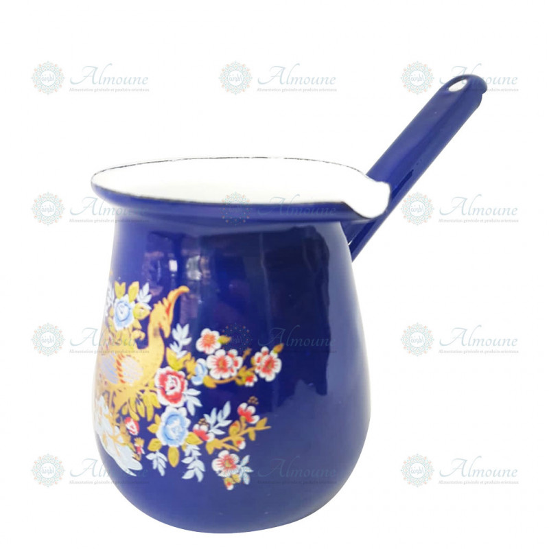 Cafetière traditionnelle avec un fond large et une longue poignée. Le bord est conçu de façon à servir le café sans en renverser.