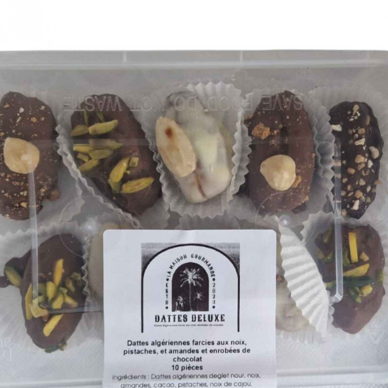 Ces dattes algériennes sont charnues avec une belle consistance. Pour encore plus de gourmandise elles sont farcies de fruits secs et enrobées de chocolat.