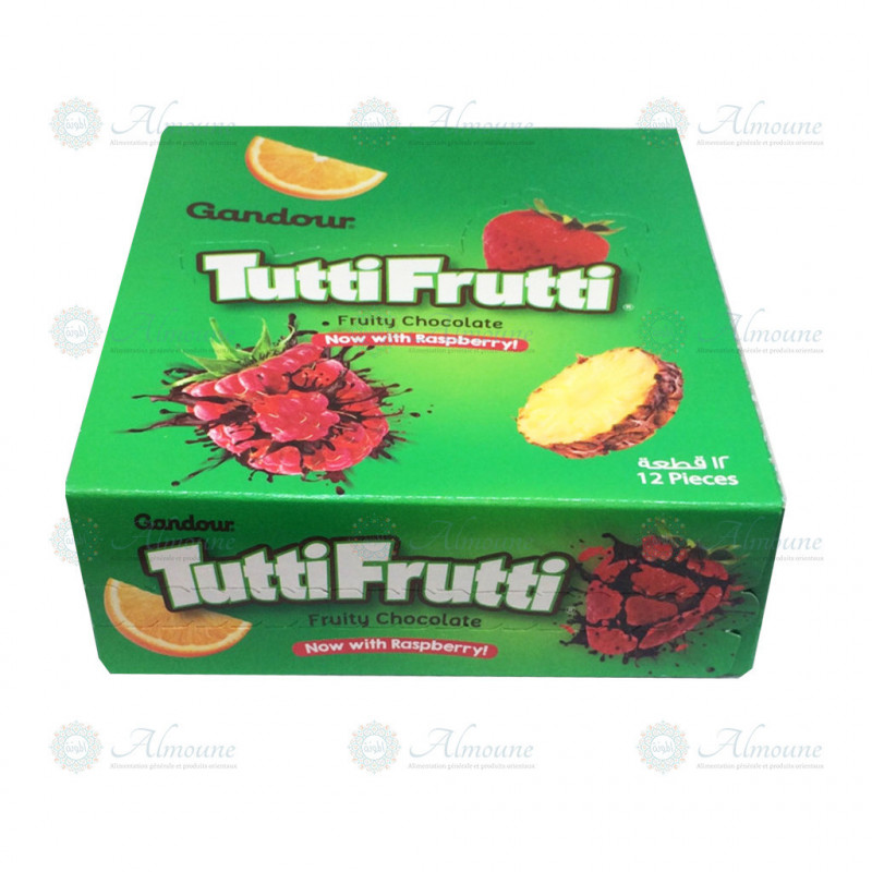 Savourez le goût intense du chocolat dans chaque bouchée. Ingrédients : Sucre, extrait sec de lait, matière grasse végétale (palme), extrait sec de cacao, beurre de cacao, sirop de glucose, humectant (glycérol), émulsifiants (E322 d'origine soja, E476 d'origine huile de ricin), arômes naturels et naturels (vanilline, Ananas, Fraise, Orange Framboise), Stabilisants (E401, E516, E452i), Conservateur (E202), Acide Citrique, Colorants (E102, E110, E122, E123, E133). Contient des conditionneurs alimentaires, des émulsifiants, des stabilisants, des arômes, des conservateurs et des colorants autorisés. Ce produit contient de la graisse végétale et du beurre de cacao.