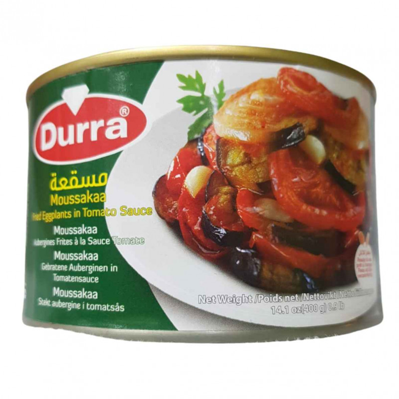 Aubergine marinée Moussaka Durra 400gr. ingrédients: tomates 58%, aubergines 33%,oignons 5%, huile de tournesol 2.5%, Ail 0.5%, Sel 0.5%, sauce chili 0.5%.
